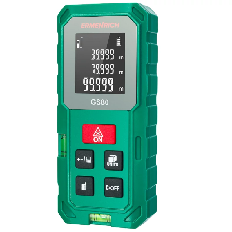 Az Ermenrich Reel GS80 lézeres mérőt építési vagy javítási munkák során végzett mérésekhez tervezték. Funkcionalitása az egyik fő előnye. Nemcsak távolságok és tárgyak lineáris méreteinek meghatározását teszi lehetővé, hanem a terület és a térfogat kiszámítását is. A Pitagorasz-tétel funkció segít kiszámítani két pont közötti távolságot közvetett mérések segítségével. A két vízszintes buborékos vízmérték lehetővé teszi a készülék vízszintes elhelyezését, hogy a mérések a lehető legpontosabbak legyenek.