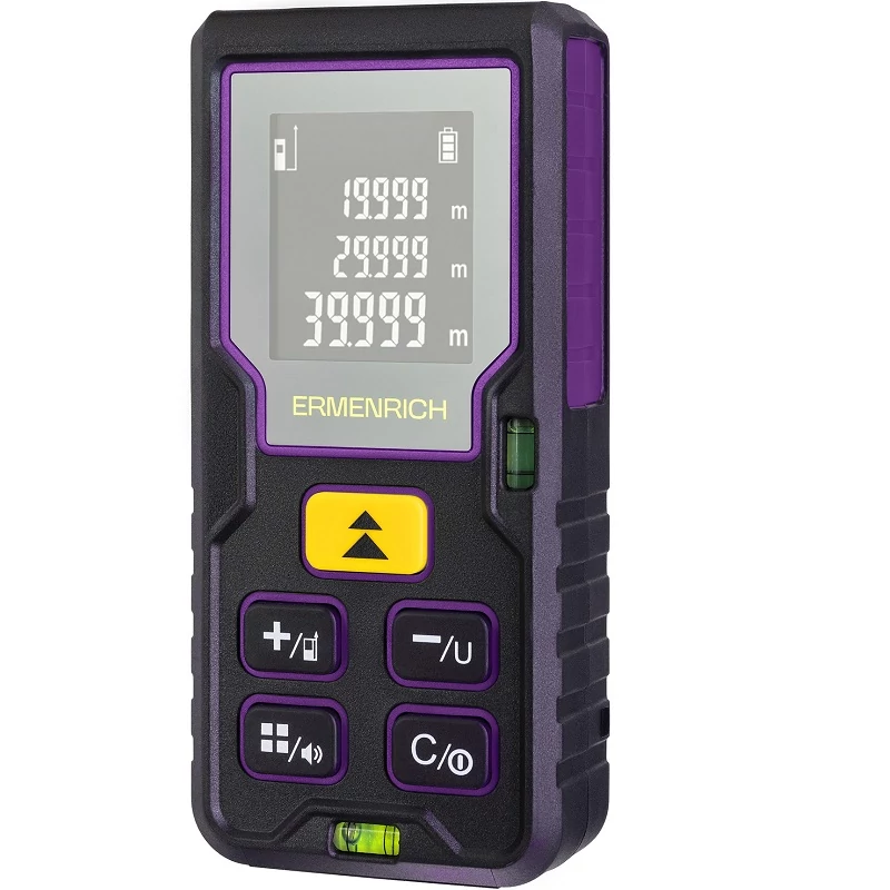 Az Ermenrich Reel PLUS GD100 lézeres mérő egy multifunkcionális készülék amely sokféle feladatot képes elvégezni a gépészet, az építőipar és a felújítás területén. Legjobban nagy helyiségek lineáris, terület- és térfogatmérésére alkalmas – egy oldalon akár 100 méterig. Az egyszeri mérések mellett automatikusan is pásztázhat egy helyiséget. Az adatok a 3 soros LCD kijelzőn jelennek meg, és egyszerre akár 20 eredménycsoport is tárolható. Hangjelzések nélküli működés is lehetséges.