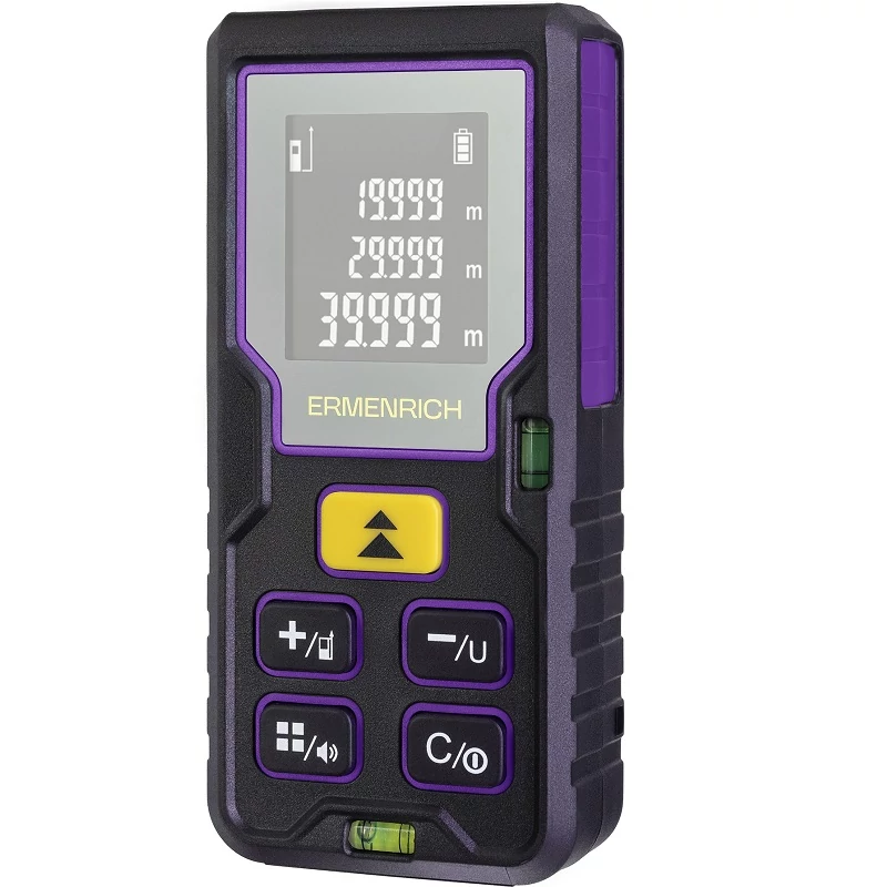 Az Ermenrich Reel PLUS GD40 lézeres mérő kis és közepes méretű helyiségekben különféle mérésekhez alkalmas mérőműszer. Ez a sokoldalú eszköz használható az építőiparban, a felújításban és a belsőépítészetben, a gyártásban, az összeszerelési munkákban és számos más helyen. A lézeres mérő által mérhető maximális hossz 40 méter. Az egyszeri távolságmérésen felül a lézeres mérő folyamatos mérési üzemmódban terület- és térfogatmérésre is képes.