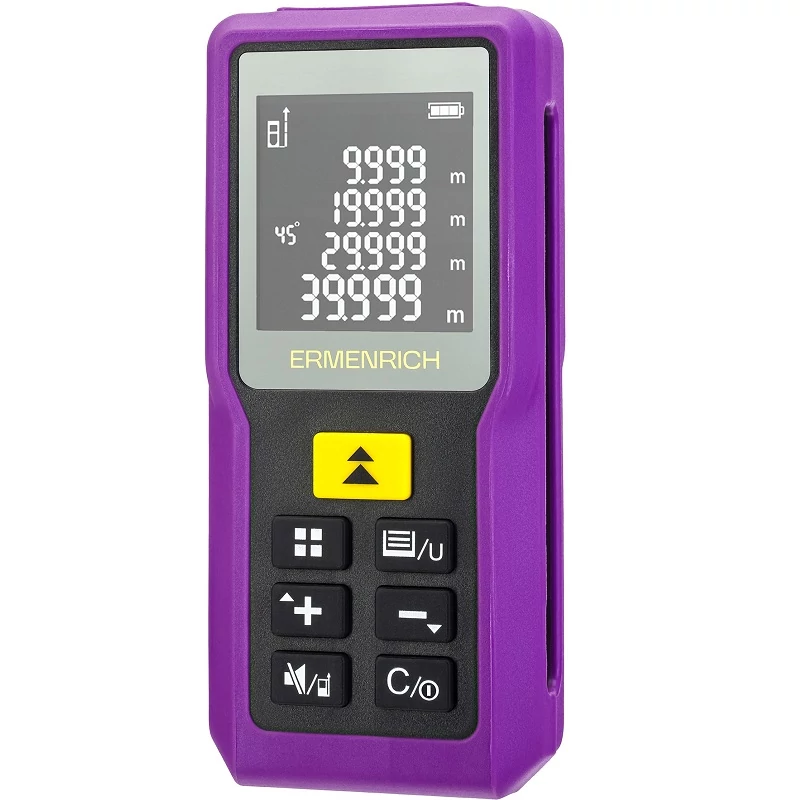 Az Ermenrich Reel PRO GM100 építési és felújítási helyszíneken végzett mérésekhez tervezett lézeres mérőműszer. Telekhatár-felmérésekhez, földmérési munkákhoz és más olyan alkalmazásokhoz is használható, ahol az objektum lineáris méretének, területének és térfogatának pontos mérésére van szükség. A legnagyobb mérhető távolság 100 méter. A lézeres mérő lézeres szögmérőként is használható. A Pitagorasz-tétel funkciónak köszönhetően automatikusan kiszámítja a távolságokat a közbenső mérések után. Ez a funkció különösen akkor hasznos, ha a lézert nem lehet közvetlenül a két pont közé kihúzva elhelyezni.