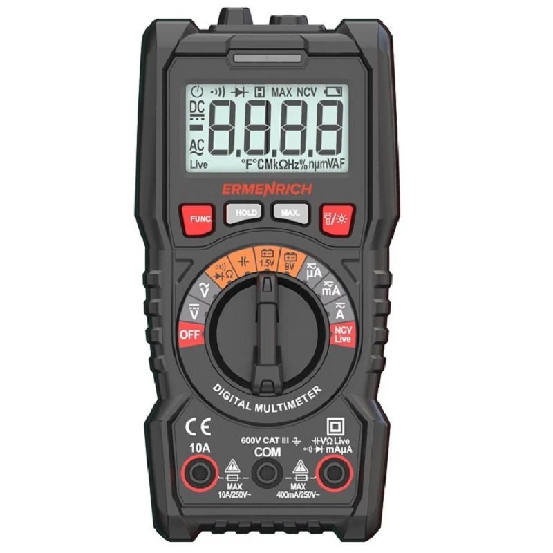 Az Ermenrich Zing TC13 digitális multiméter egy multifunkcionális, hordozható eszköz, mely az elektromos hálózatok tesztelésére és az elektromos jel jellemzőinek mérésére szolgál. A készüléket szakemberek általi professzionális használatra tervezték, de háztartási feladatokra, laikusok számára is alkalmas. A feszültség, az áramerősség és az ellenállás mellett az Ermenrich Zing TC13 kapacitást, frekvenciát és munkaciklust is képes mérni.