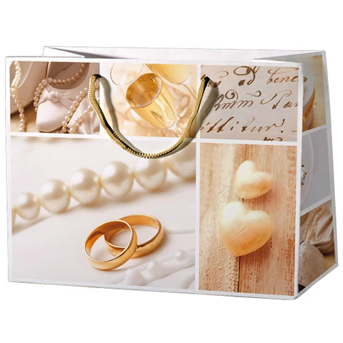 Ezzel a szép, de ugyanakkor kellőképp esküvői hangulatú ajándéktasakkal biztos, hogy nem fogunk mellé lőni egy olyan nagyszabású esemény során, mint egy lakodalom, ahová egészen biztos, hogy egy nászajándékkal érkezünk, amit diszkréten adhatunk át az ifú párnak. A nagy méretű, álló kialakítású ajándéktáska kiváló minőségű, telített színekkel készített nyomata szép megjelenést, míg a lakkozott vastag papír és az erős zsinórfüles kialakítás tartósságot kölcsönöz neki, hogy a benne lévő ajándékok biztonságban legyenek.