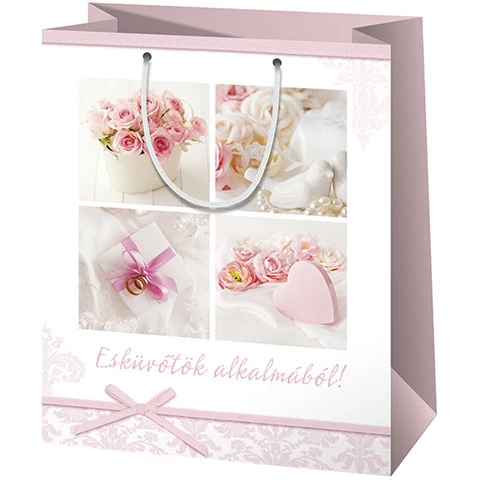 A nászajándék kiválasztása legalább olyan kihívás lehet, mint a megszerzett ajándék csomagolása, amihez most nagy segítség lehet ez az ajándéktáska, amit romantikus képek, babarózsaszín és fehér színek varázsolnak alkalomhoz méltóvá. A nagy méretű, álló kialakítású ajándéktáska kiváló minőségű, telített színekkel készített nyomata szép megjelenést, míg a lakkozott vastag papír és az erős zsinórfüles kialakítás tartósságot kölcsönöz neki, hogy a benne lévő ajándékok biztonságban legyenek.