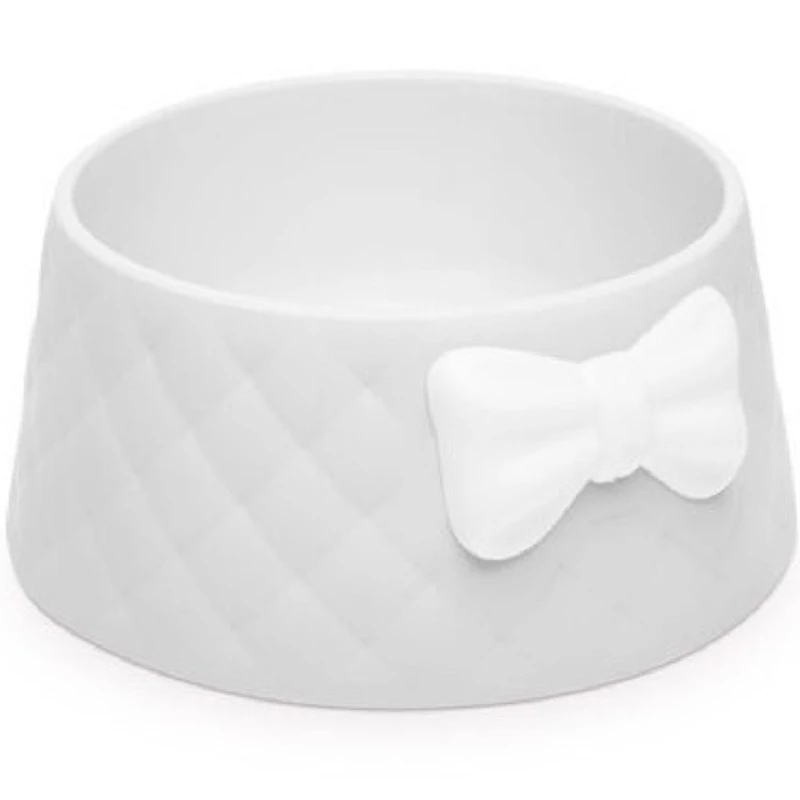 Etetőtál 18x8 cm szürke. Klasszikus etetőtál, itatótál, masnival és rombusz mintával díszített oldalfallal. Ideális lehet kiskutyák, macskák részére is. A tál mélysége lehetővé teszi, hogy itatótálként is használhassuk.