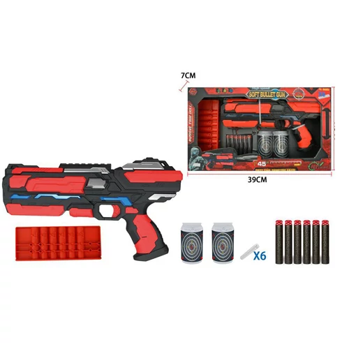 A szivacslövő fegyverek nagyszerű lehetőséget kínálnak a gyerekek számára, hogy a sérülés veszélye nélkül játszhassanak, és lőhessék egymást. A fegyver vagány kialakítás és mutatós piros és fekete színeket kapott, ráadásul a készletben találunk hat darab lövedéket is, és megfelelő célpontokat, hogy ellenfél híján is lehessen gyakorolni a célba lövést. Noha a fegyver biztonságos, azért soha ne célozzunk vele a ellenfél arcára, nehogy a lövedék a szemet találja el.