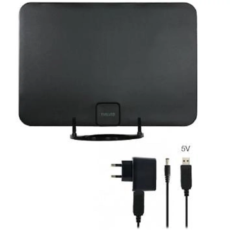 Aktív beltéri antenna, FM/DAB+/DVB-T2 jelvételére, 45 dBi erősítés, LTE, 4G, 5G szűrő, hálózati adapter, IEC dugós kábel