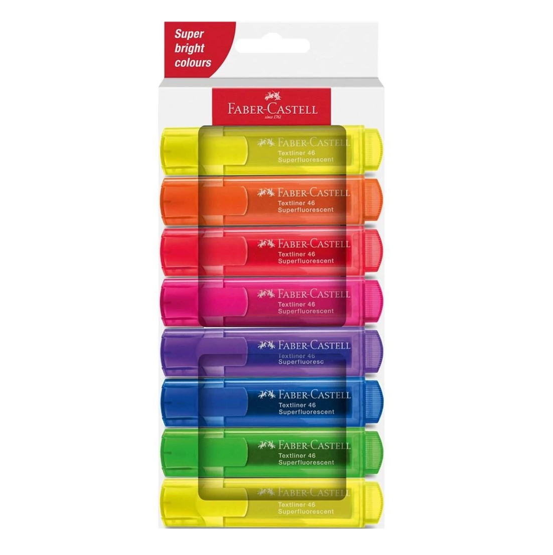 A Faber-Castell 8 darabos szövegkiemelő készlet különféle színekben érkezik kartoncsomagolásban. Ezek a szövegkiemelők magas minőségű szuperfluoreszkáló neon színekkel rendelkeznek, melyek ideálisak a kiemeléshez, aláhúzáshoz és kiemeléshez. Bárhol alkalmazhatóak, és tökéletesen működnek mindenféle papírtípuson.