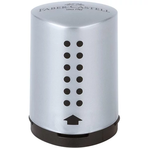 A Faber-Castell Grip sorozatához tökéletesen illeszkedik ez az ezüst színű hegyező, ami nem csak a klasszikus háromszög formát követi, hanem a jellegzetes csúszásgátló pöttyökkel is el van látva.