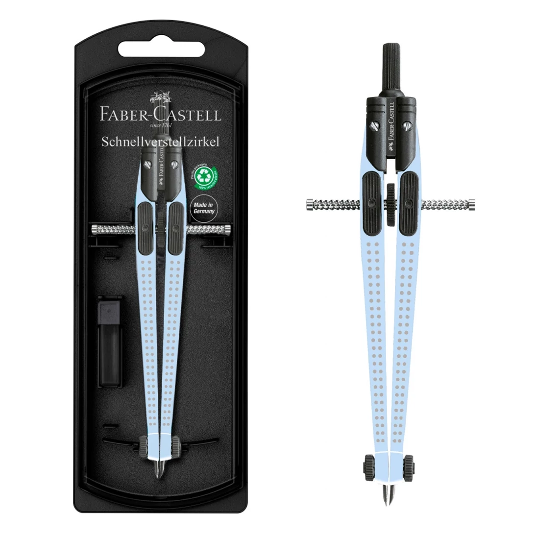 A Faber-Castell GRIP égkék körző szett gyorsállítóval a kiváló minőség és funkcionalitás tökéletes összhangját kínálja. A GRIP termékcsalád egyik tagjaként ez a körző felületén apró csúszásgátlós pöttyökkel rendelkezik, biztosítva a stabil fogást és a pontos vezetést a papíron.