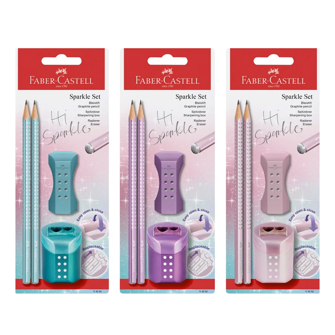 A Sparkle szett többféle színváltozatban érhető el: türkiz, lila és rózsaszín árnyalatok közül lehet választani, így minden gyermek megtalálhatja a saját kedvencét. A ceruzák háromszög alakú teste biztosítja a kényelmes fogást, a rajtuk lévő csillámos díszítés pedig igazán egyedivé teszi őket. A radír ergonomikus kialakítású, precíz törlést tesz lehetővé, míg a hegyező zárt tartálya gondoskodik a tiszta munkaasztalról.
