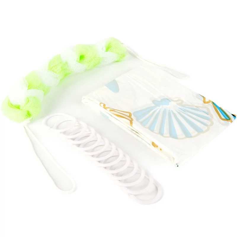 Fürdőszobák nélkülözhetetlen kelléke a zuhanyfüggöny, legyen szó zuhanytálcáról vagy fürdőkádról. Ezzel a zuhanyfüggöny szettel biztosan nem tud melléfogni, minden fürdőszoba hangulatát feldobja. Használata egyszerű, csak akassza be a lyukakba a karikákat és rögzítse a zuhanyfüggöny rúdon. A szett részét képezi egy hosszúkás fürdőpamacs is, mindkét végén madzaggal, amely segítségével gyerekjáték például a hátmosás.