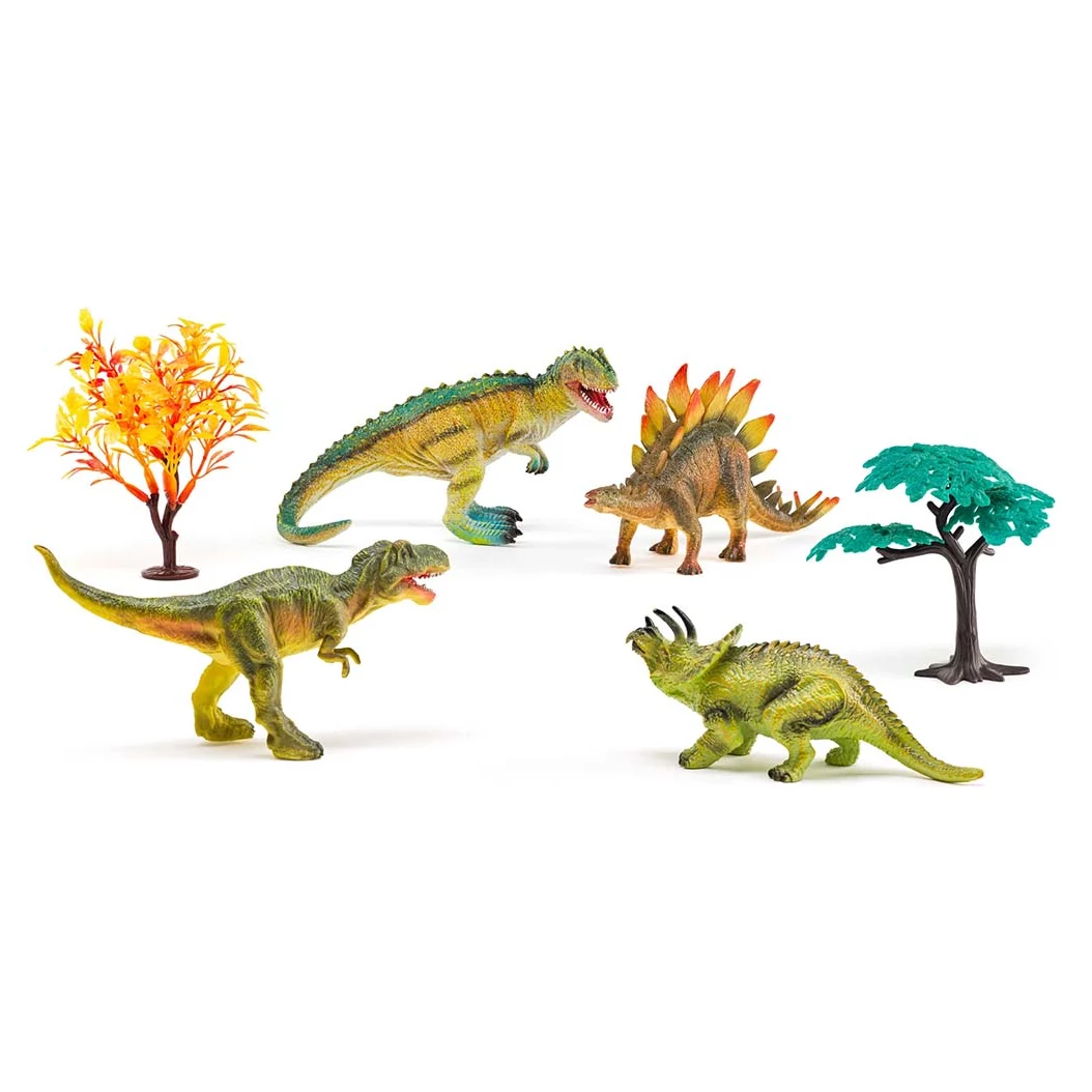 A készletet két dekorációs fa egészíti ki, amelyek segítségével könnyedén kialakítható egy saját dinoszaurusz élőhely. A figurák strapabíró műanyagból készültek, így jól bírják az aktív játékot akár beltéren, akár a szabadban. A dinoszauruszok mérete ideális a kisebb kezek számára is, így már óvodás kortól remek választás.
