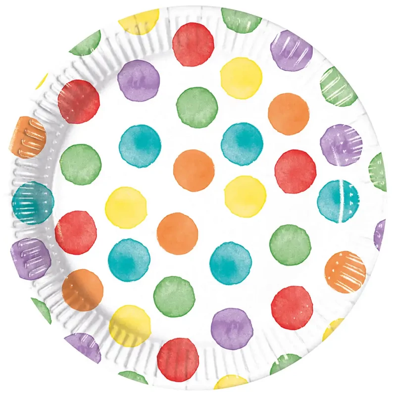 Vidámság, játékosság és színek minden mennyiségben – ez jellemzi ezt a színes pöttyös papírtányért, ami tökéletes kiegészítője bármilyen gyerekbulinak vagy születésnapi partinak! A fehér alapot élénk színű pöttyök díszítik: piros, kék, sárga, zöld, narancs és lila árnyalatok keverednek, akvarell hatással, ami még játékosabbá és modernebbé teszi az összhatást. Tökéletes választás, ha nem tematikus, de mégis mutatós, színes terítéket szeretnél.