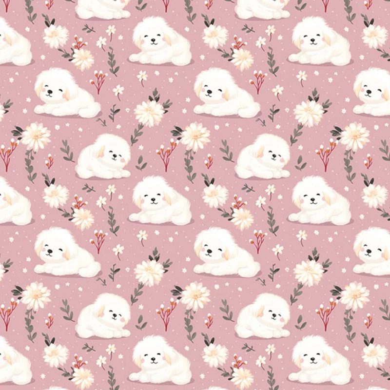 Minta: fehér kiskutyák virágokkal, rózsaszín alapon