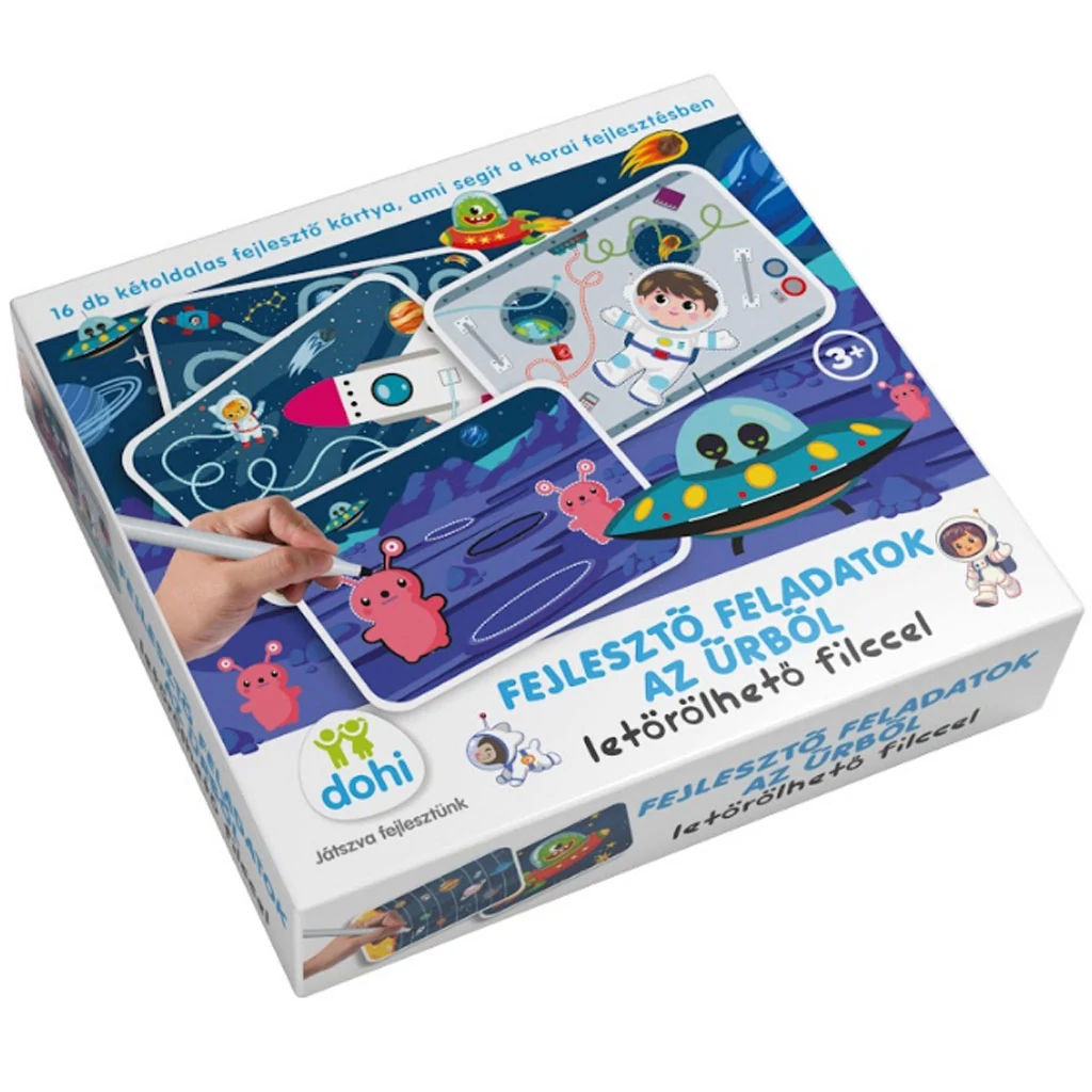 A csomag 16 darab kétoldalas kártyát tartalmaz, tele változatos feladványokkal, mint például útvesztők, pontösszekötések, vonalvezetési gyakorlatok és minták kiegészítése. A letörölhető filcnek köszönhetően a gyerekek újra és újra nekivághatnak a feladatoknak, ami biztosítja a hosszú távú használatot és a végtelen játékélményt. A kártyákon szereplő vidám, űrhöz kapcsolódó illusztrációk, például űrhajósok, űrlények és rakéták, garantáltan magával ragadják a gyerekek fantáziáját.