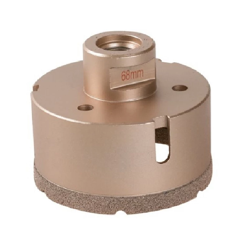 Ajánlott munkafolyamat - csavarja a koronát közvetlenül a sarokcsiszoló fejének menetére, húzza meg erősen, kezdje el kivágni a kívánt lyukat 45°-os szögben, a korona és a csiszoló fordulatszáma azonnal biztosítja az illeszkedést a kívánt helyre, lassan, egyenletes nyomással egyenesítse a fúrás irányát függőleges helyzetbe, kisebb átmérőjű 6 - 14 cm a kemény csempékbe való fúráshoz, minden lyuk között.