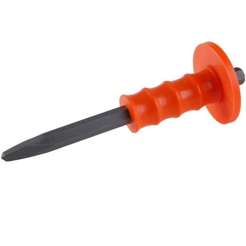 Hegyes véső műanyag védővel. Króm-vanádium anyagból. Kő, tégla, építőanyagok megmunkálására alkalmas.