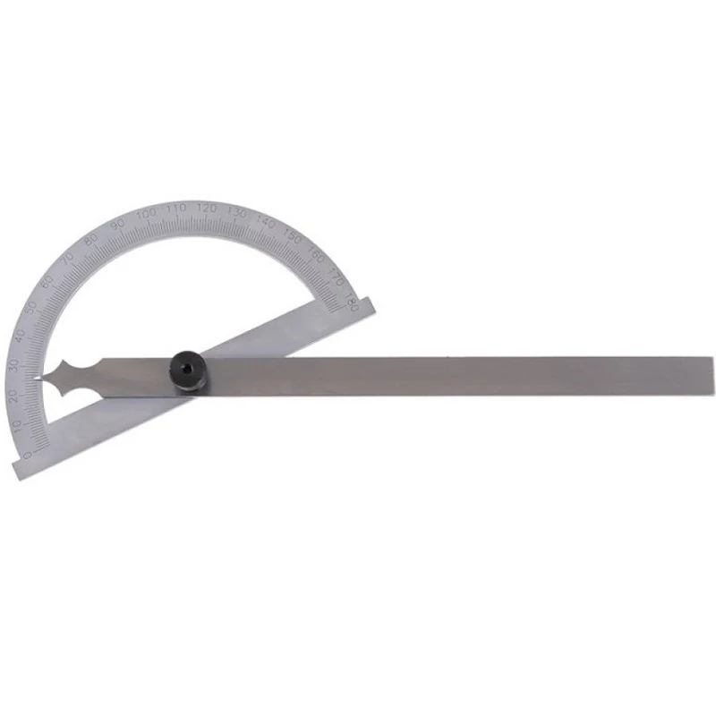 Szögmérő forgókarral, szögmérő alap hossza 150 mm, forgókar hossza 200 mm, 0 - 180°, a mért szög rögzíthető az átvitelhez. Rozsdamentes acél, bőr tok.