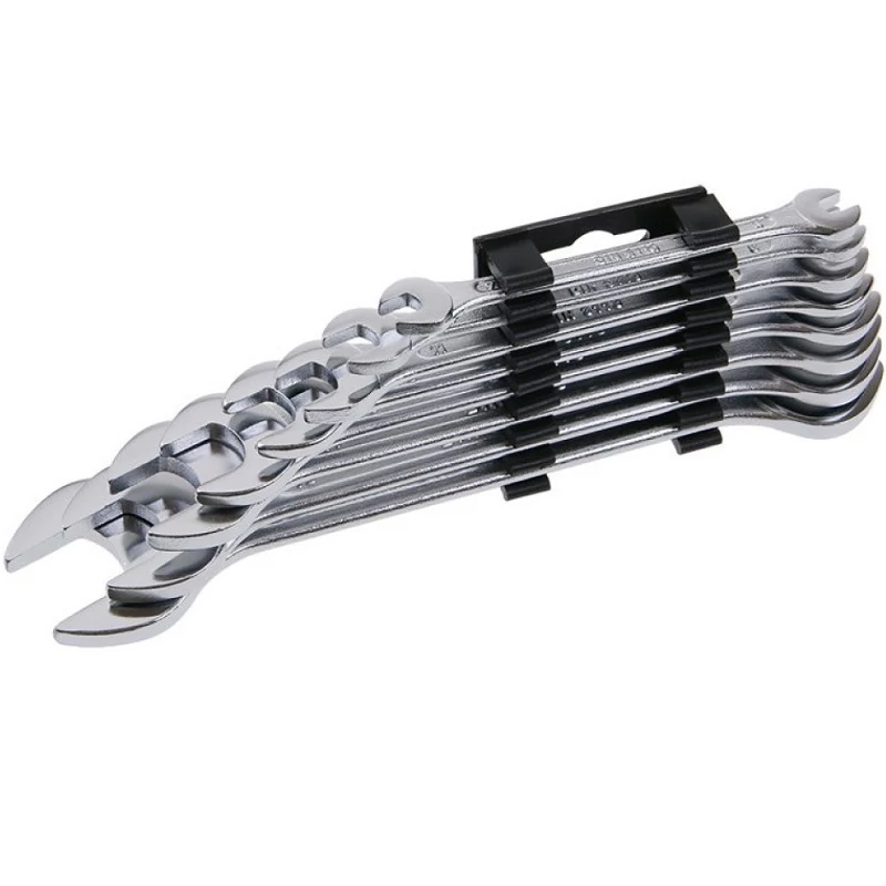 A FESTA nyitott kulcskészlet egy kis műanyag rendezőt tartalmaz egy papírdobozban. A nyitott végű dugókulcsok kiváló minőségű króm-vanádium acél szerelvényekből készülnek. Ez az acél a kívánt tulajdonságokra finomítva és matt kemény krómmal felületkezelve az optimális felületi keménység és a korrozív hatásokkal szembeni ellenállás elérése érdekében. Minőség, keménység és pontosság tekintetében pontosan megfelelnek a DIN3110 szabványnak.