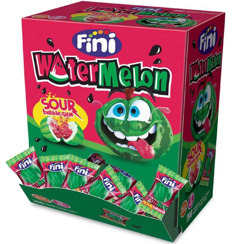 Képzelj el egy görögdinnyét, aki úgy döntött, hogy rágógumisztár lesz. A Fini Watermelon Fizzy Bubble Gum nem csak egy rágógumi – egy görögdinnyés édesség robbanása, benne egy meglepetéssel. Minden egyes darab savanykás, csillogó belső teret rejt, fekete „magokkal”, amelyek karaktert adnak. Ideális azok számára, akik szeretik, ha a rágógumi többet csinál, mint csak rág