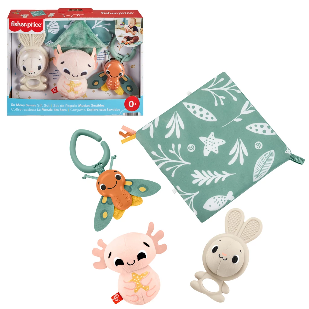 A legkisebbek az érzékeiken keresztül fejlődnek. A Fisher-Price Helló Érzékelés játékszett négy játékot tartalmazó készlet a legkisebbek számára. A csomagban egy BPA mentes nyuszi rágóka kivehető csengő pofilabdával, egy imádnivalóan puha csilingelő axolotl, és kettő hordozható és a babakocsira is könnyen rögzíthető játék, egy zörgős mini lepedő és egy sokféle textúrával rendelkező pillangós rázóka pajti is található.