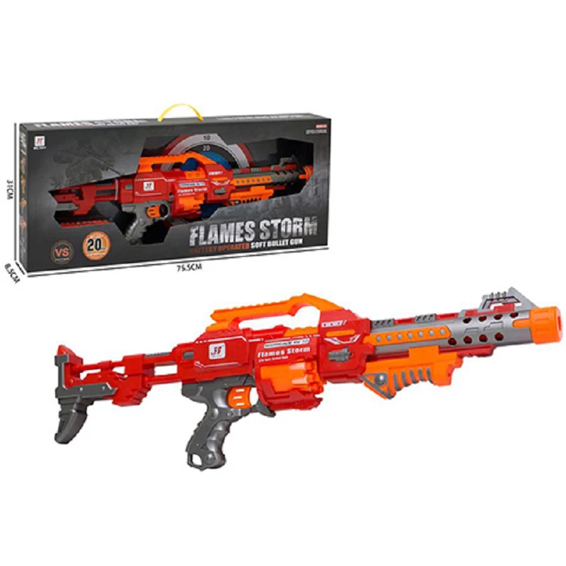 A Flames Storm szivacslövő puska nagy méretű, 75 cm hosszú harci fegyver amelyet gyermeked kiválóan bevethet barátai ellen a szivacslövő csata során.