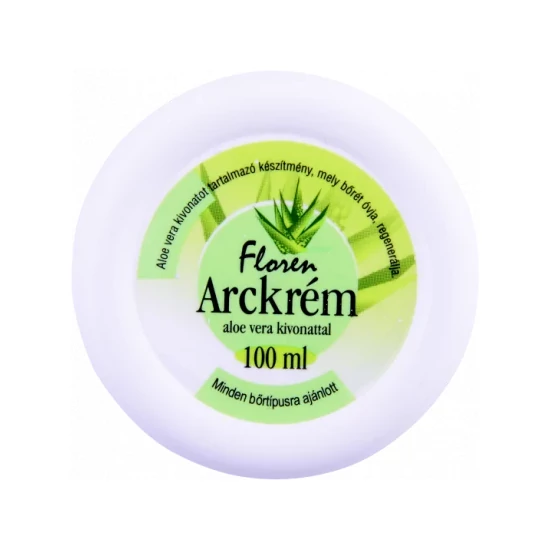 Floren aloe vera kivonatot tartalmazó hidratáló és regeneráló arckrém. 100 ml tégelyes kiszerelésben.