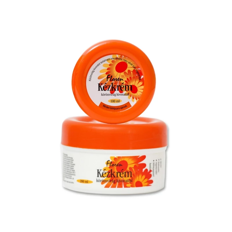 Floren kézápoló krém 200 ml.A körömvirág kivonat táplálja és óvja az igénybe vett kéz bőrét. Használata során segít megőrizni a bőr nedvesség háztartásának az egyensúlyát, B5-provitamin tartalma elősegíti a sejtregenerálódási folyamatokat.