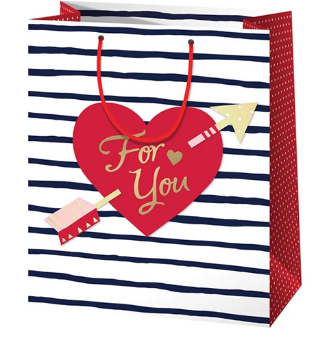 Ez a tasak egy igazán romantikus ajándékhoz lett tervezve, hiszen a csíkos mintát egy hatalmas, nyíllal átlőtt szív fedi, amiben arany színű "For You" biztosítja az ünnepeltet, hogy a csomagban található ajándékot valóban neki szántuk. A közepes méretű, álló kialakítású ajándéktáska kiváló minőségű, telített színekkel készített nyomata szép megjelenést, míg a lakkozott vastag papír és az erős zsinórfüles kialakítás tartósságot kölcsönöz neki, hogy a benne lévő ajándékok biztonságban legyenek.