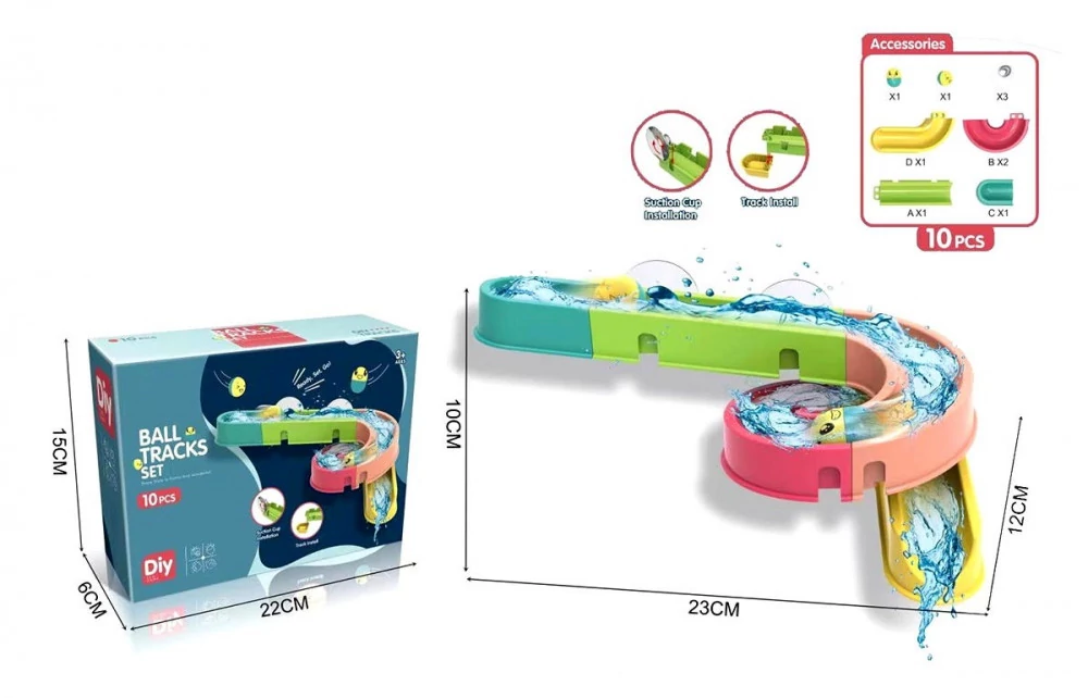 Fürdőkádba illő golyóspálya a legkisebbeknek. A szettel egy mini golyópályát építhetünk meg és ragaszthatunk fel tapadós korongokkal a fürdőkádhoz. Csak ráejtjük a golyókat és már száguldanak is lefele a vízi csúszdán. Jó szórakozás a gyerekeknek a fürdetés alkalmával. A játék játék leköti a gyerekek figyelmét, így a kismamáknak is könnyebb dolga van fürdetéskor.