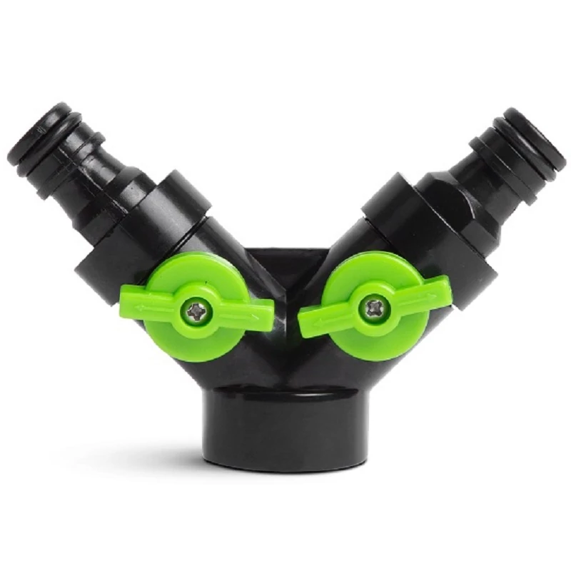 Külső menetes kerti csapokra, tömlőcsatlakozókra felszerelhető "Y" alakú elosztó, amely áganként elzárócsappal rendelkezik.