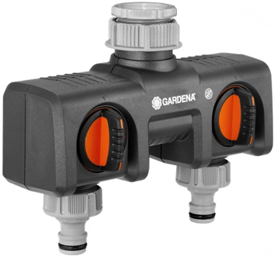 "2 csatlakozókészülék üzemeltetésére.A vízátfolyás szabályozható és elzárható. 2 GARDENA öntözőkomputer vagy öntözőóra csatlakoztatható hozzá. GARDENA Profi-Systemre átszerelhető GARDENA Profi-System csapelem segítségével (cikksz. 2801). Színes fóliás kártya. 26,5 mm-es (G 3/4) vízcsaphoz 33,3 mm-es (G 1) menettel és 21 mm-es (G 1/2) vízcsaphoz 26,5 mm-es (G 3/4) menettel."