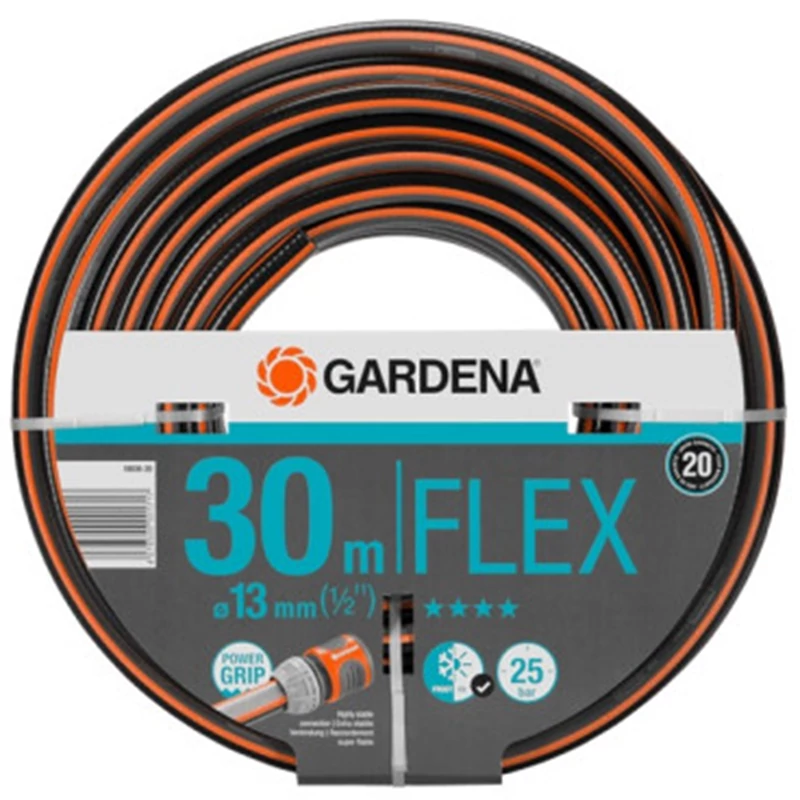 Repesztő nyomás 25 bar Tömlő hossza 30 m Tömlő átmérő szimpla 13 mm A GARDENA Comfort FLEX 13 mm-es (1/2") tömlő 30 m hosszú, átmérője 13 mm (1/2"). A Power Grip bordázat stabil csatlakozást és optimális tartást biztosít a tömlő és a tömlőelem vagy a vízmegállító között. Mivel a tömlő UV- és fagyálló, egész évben a szabadban maradhat. A vastag tömlőfalnak köszönhetően a tömlő hosszú élettartamú, és akár 25 bar nyomáson is használható. Szennyezőanyag-, ftalát- (<0,1%), kadmium-, ólom- és báriummentes (<0,1%).