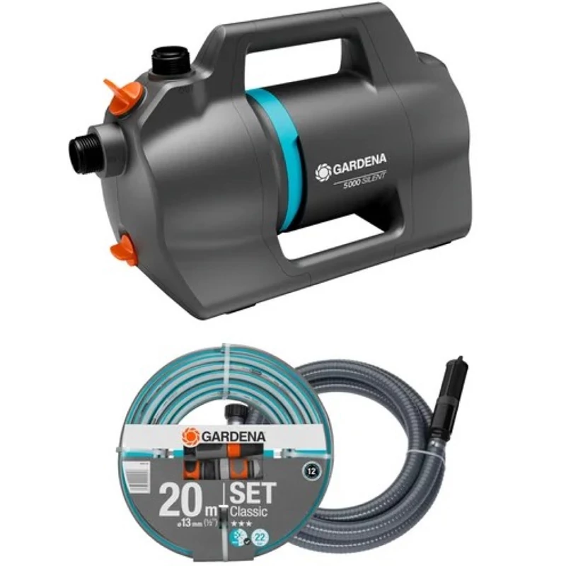 Tartalom: 1x Kerti szivattyú 5000 Silent, 1x 20m 13mm (1/2") tömlő szerelvényekkel, 1x 3,5m szívókészlet 25mm (1")