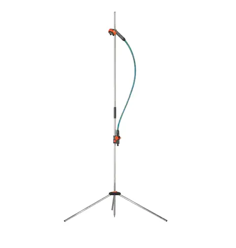 A szabadban is olyan kényelmesen zuhanyozhat, mint a fürdőszobában. A háromlábú állvánnyal bárhol könnyedén felállítható. Állítható magasságú és levehető zuhanyrózsa, 1,3 m hosszú tömlővel. Két különböző vízsugár forma választható: lágy és szélessugarú zuhany, vagy finom, beállítható ködpermet. A magasság fokozat nélkül állítható. Az átfolyó vízmennyiség szabályozó- és elzáró-szeleppel állítható.