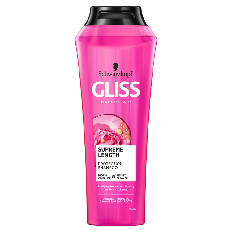 Schwarzkopf Gliss Supreme Length hajregeneráló sampon hosszú, sérülékeny hajra és zsíros hajtövekre mikro-regeneráló-lipidekkel és bazsarózsa kivonattal. Eltávolítja a felesleges olajat a hajtövekről és regenerálja a sérült hajat. A Gliss Kur formulák Keratin Szérummal gazdagítva regenerálják a sérült hajat és a haj sejtszerkezetét megerősítve nyújtanak védelmet a jövőbeni károsodások ellen.