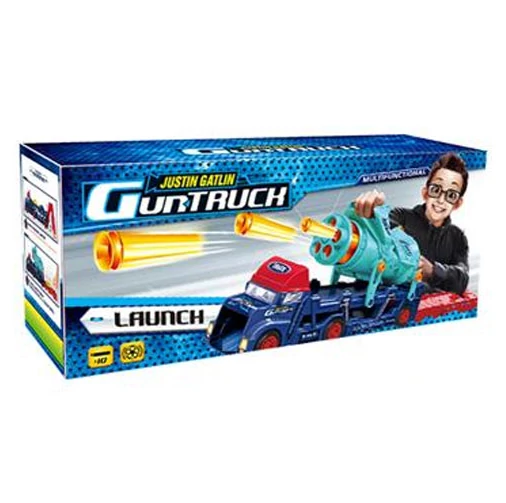 Kisfiad szereti a kamionokat? Lepd meg őt ezzel a multifunkciós kamionnal, amivel sokat szórakozhat majd. A kamion nagy méretének köszönhetően helyet kapott rajta egy kilövő, amivel a szivacslövő fegyvereknél használatos szivacs lövedékeket lehet kilőni, amiknek a végén tapadókorongok találhatók. A kamion hátulján ezen kívül egy autó kilövő is található, mellyel a hagyományos matcbox méretű autókat lehet kilőni, azok végig gurulnak a kamion belsejében, majd az a kamion orrából kijön. A szetthez tartozik egy csavarhúzó, amivel a kilövőt lehet fixálni, valamint 10 db szivacs lövedék.