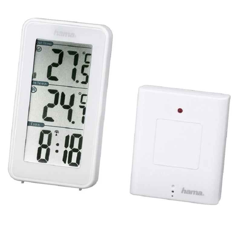 - Két részből álló készlet, amely bázisállomást és vezeték nélküli kültéri érzékelőt tartalmaz az idő és a hőmérséklet kijelzésére