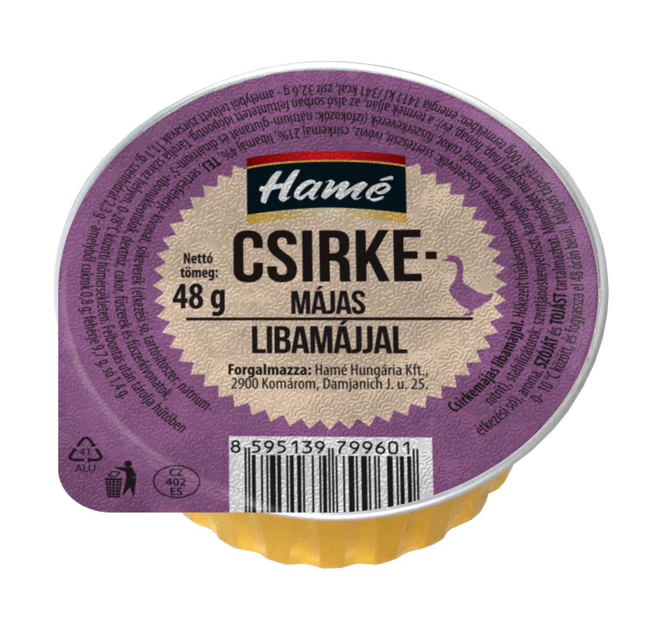 Sertészsír, Ivóvíz, Csirkemáj 21%, Libamáj 4%, TEJ, Sertésfehérje-kivonat, Sókeverék (étkezési só, tartósítószer: nátrium-nitrit), Stabilizátorok: szentjánoskenyérliszt, karragén, kálium-klorid, Cukor, Fűszerkeverék (ízfokozók: nátrium-glutamát és dinátrium-5'-ribonukleotidok, dextróz, cukor, fűszerek és fűszer kivonatok, étkezési só), Aroma.