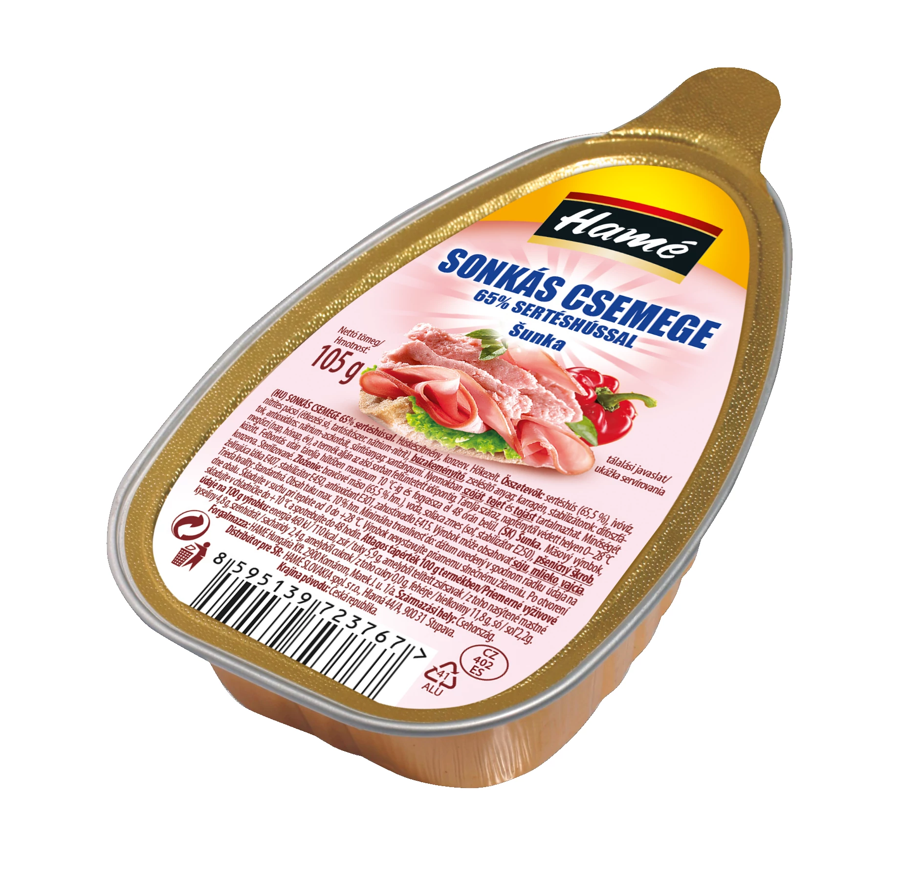 Sertéshúsból készült sonkás csemege 65% hústartalommal.