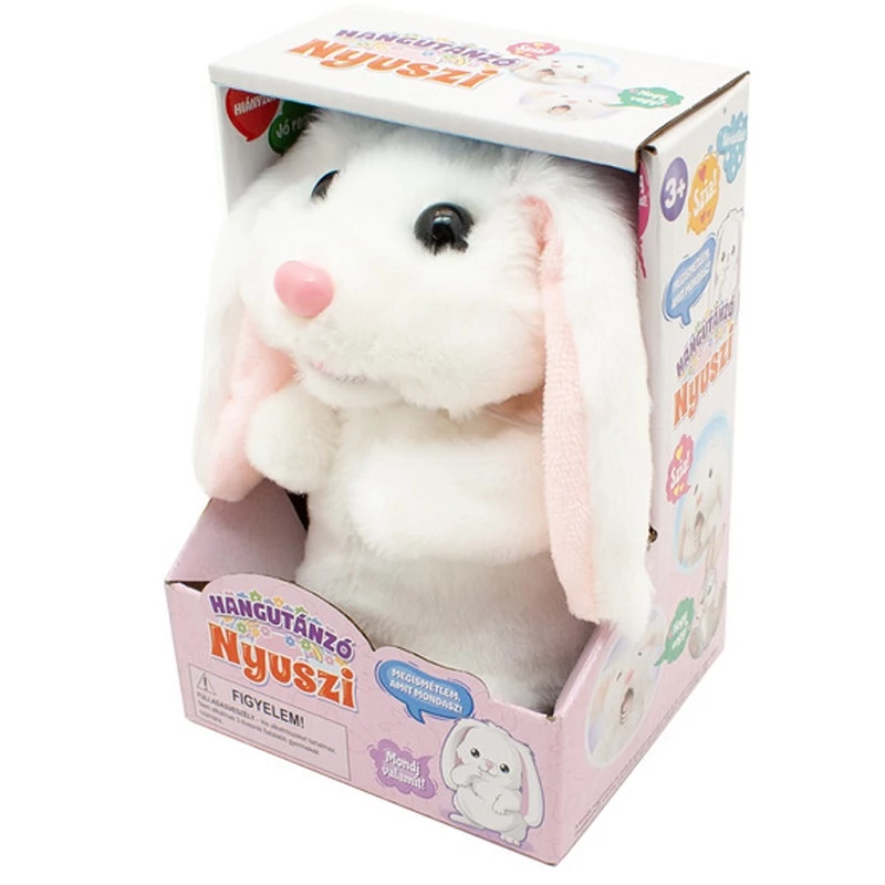 Ez a cuki, fehér hangutánzó nyuszi garantáltan belopja magát a gyerekek szívébe! Nemcsak puha és ölelni való, hanem szórakoztató társ is, aki minden kimondott szót visszamond aranyos, nyuszis hangon. A gyerekek imádni fogják, ahogy a nyuszi utánozza őket, miközben bájosan mozgatja a testét is – ezzel még élvezetesebbé teszi a közös játékot.