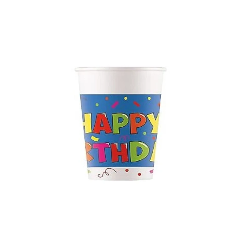Party papír pohár, 8 db/csomag, 200ml. Happy birthday feliratt, kék alapon, party mintákkal.