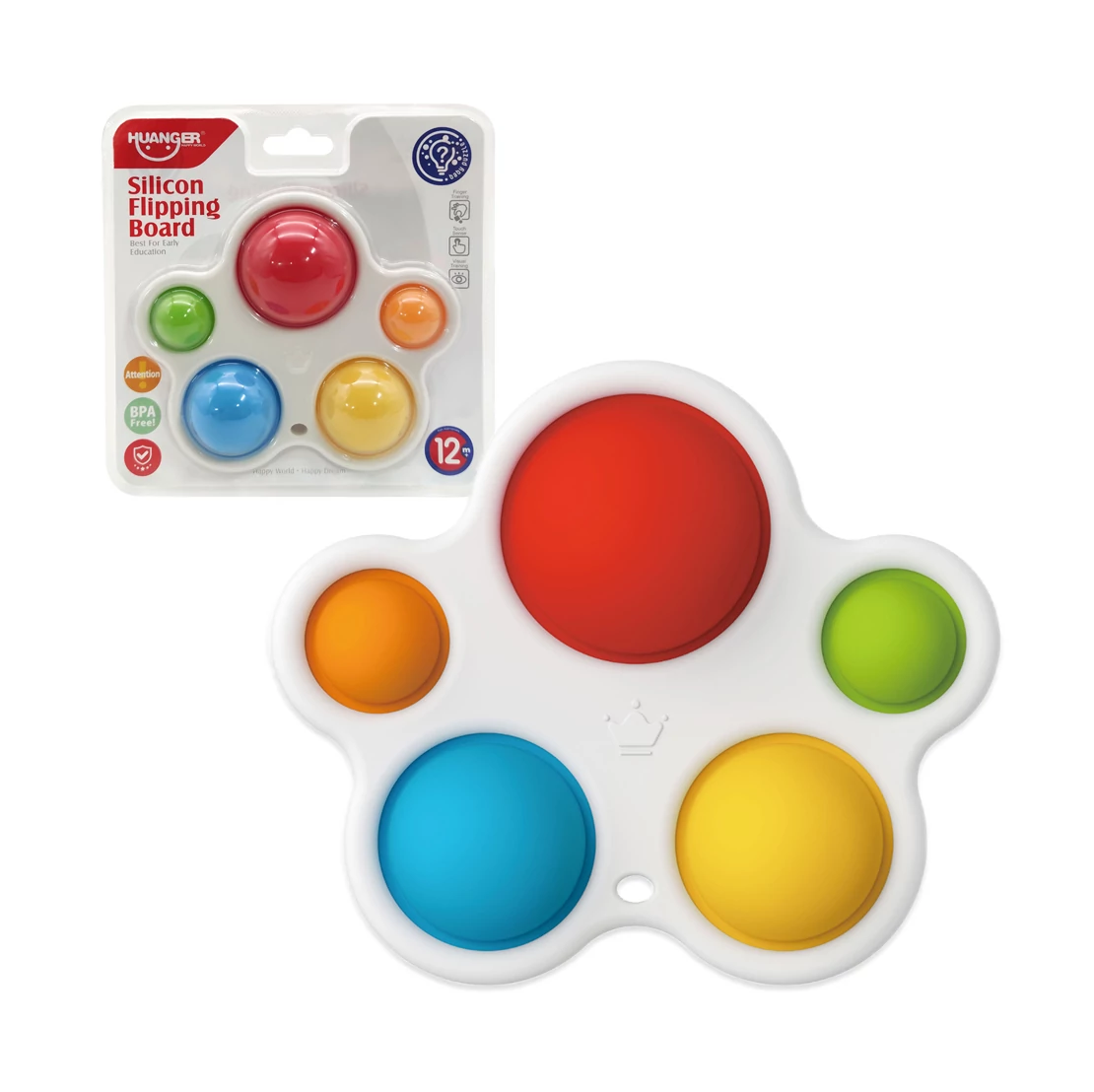 A játék fehér alapon öt különböző méretű és színű kis buborékkal rendelkezik, amelyek játék közben kiemelkednek és visszahúzódnak, miközben a gyermekek nyomkodják és felfedezik őket. Ez a dinamikus mozgás nemcsak szórakoztató, hanem segít fejleszteni a kisgyermekek motorikus készségeit is.
