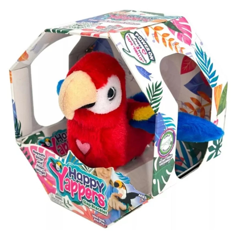 A Happy Yappers interaktív plüss piros papagáj egy vidám és különleges játék, amely életre kelti a gyerekek fantáziáját! Csak csapd a csuklódra a színes slap bracelet segítségével, és a papagáj mindig veled lesz. A mellkasán található szív megnyomásával elkezd ismételni, énekelni, csapkodni a szárnyaival, sőt, még más Happy Yappers figurákkal is tud „beszélgetni”! A játék mókás hangokkal és mozgásokkal szórakoztat, így a gyerekek könnyedén elmerülhetnek a játék világában. Ideális választás ajándéknak, hiszen egyszerre plüssfigura és interaktív társ, amely minden kalandot feldob. Hagyd, hogy a Happy Yappers piros papagáj berepüljön otthonodba, és kezdődhet a vidám, közös játék!