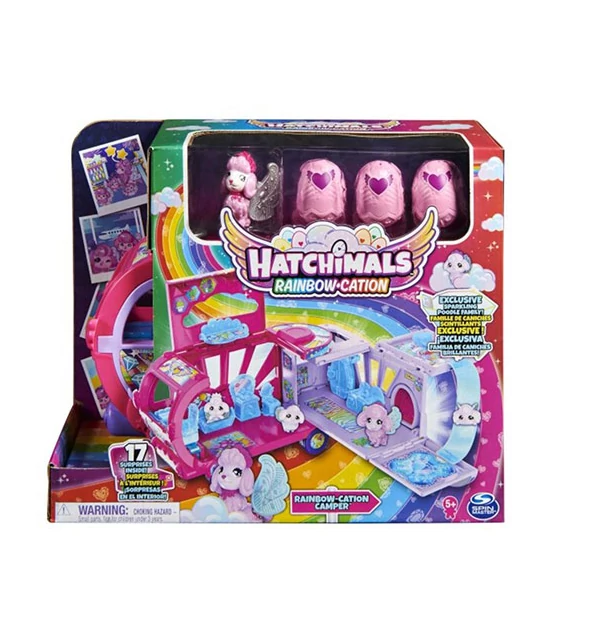A Hatchimals Rainbow Cation egy teljes szettel lepi meg a kislányokat, amelyben mindent találsz ahhoz, hogy egy szép kis történetet tudjál eljátszani és minden alkalommal még hozzáfűzzél valamit. A kis figurák nyaralásra szeretnének menni, pontosan ezért a gyönyörű, sokszínű lakóautó rendelkezésükre áll. A járműn kívül, a készlet még tartalmaz egy anya kutya figurát és három tojást. Ha ezeket a tojásokat megtöröd, bennük 4 aranyos kutyusra bukkansz. Ha megérkeztél a kívánt helyre, a lakókocsi átalakítható játéktérré, amely tartalmaz csúszdát és medencét is, ahhoz, hogy a kutyák ne unatkozzanak.