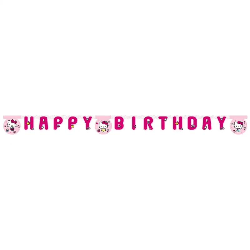 Ünnepelj stílusosan és bájos hangulatban a Hello Kitty szülinapi party bannerrel, amely tökéletes kiegészítője minden kislány álompartijának! Ez az aranyos és vidám banner a „HAPPY BIRTHDAY” feliratot formázza élénk pink betűkkel, amelyeket apró masnik, csillogó kiegészítők és természetesen Hello Kitty cuki arca tesz még különlegesebbé. A banner végein és közepén található kerek dekorációs elemek tovább fokozzák a vizuális élményt, és igazán tematikussá varázsolják a dekorációt.