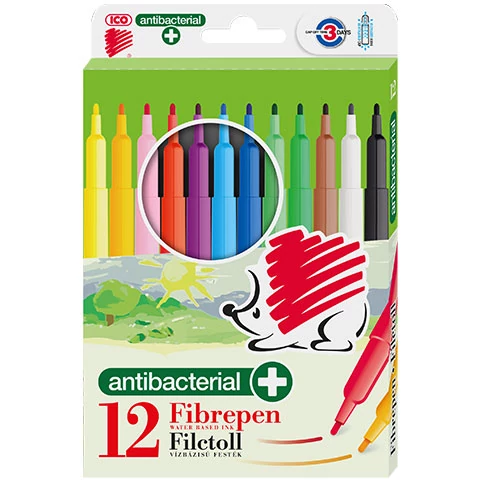 Ez a tizenkét darabos SÜNI rostirón készlet első sorban óvodákban és iskolákban remek választás, hiszen az írószer műanyag részei antibakteriális rendelkeznek, ezzel is lassítva a járványos betegségek terjedését. Az ICO rostírónok kiváló minőségéről a strapabíró hegy, illetve az élénk színű, vízbázisú festékanyag gondoskodik. A beszáradást megelőzendő a hegyet egy átlevegőzős biztonsági kupak védi, így mindig kiváló állapotban áll majd a gyerekek rendelkezésére. A műanyag alkatrészek antibakteriális védelmet adó Biomaster ezüst-ionokat tartalmaznak (biocid hatóanyag: ezüst-foszfát üveg). Az ICO Antibakteriális termékei bizonyítottan baktériumölő tulajdonsággal rendelkeznek, a felszínen megtelepedett kórokozók 24 óra leforgása alatt, 99,9% hatékonysággal elpusztulnak. Az antibakteriális hatást az angliai Industrial Microbiological Services Ltd. bevizsgálta és igazolta.