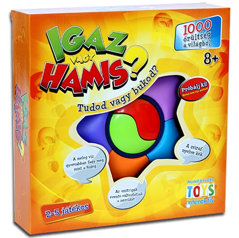 Egy játék ami a kicsiknek és a felnőtteknek ugyanolyan izgalmas, és amelyben számos új információval találkozhatnak a játékosok! Az Igaz vagy hamis? társasjátékot akár öt fő is játszhatja, a játék során pedig semmi más dolguk nincs a játékosoknak, minthogy eldöntsék: a hallott állítás igaz vagy hamis. Válaszolj idő előtt és légy résen, hiszen minden kör újabb izgalmakat rejteget. Válaszadásra kényszeríthetünk más játékosokat, vagy csapatban is összemérhetik tudásukat a játékosok. A játék 1000 kérdést tartalmaz, köztük Magyarországra és a magyar kultúrára vonatkozó izgalmas kérdéseket is.