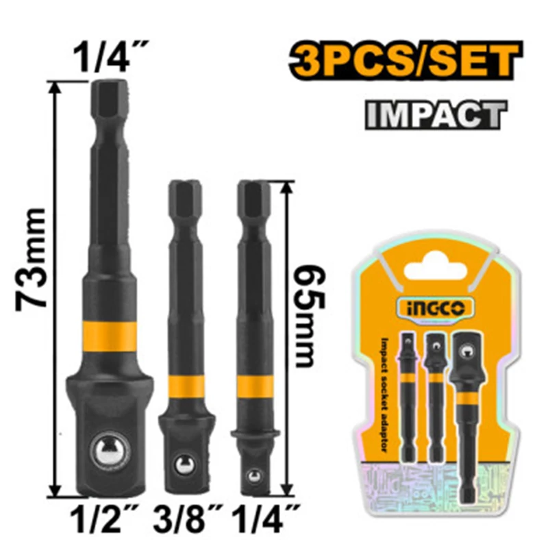 Bit csatlakozó adapterNagy nyomatékAnyaga: CrVMéretek: 1/4', 3/8', 1/2'Hossz: 65 mm (1/4', 3/8'), 73 mm (1/2') Szállítási terjedelem: 3 db dugókulcs adapter, Bliszterben