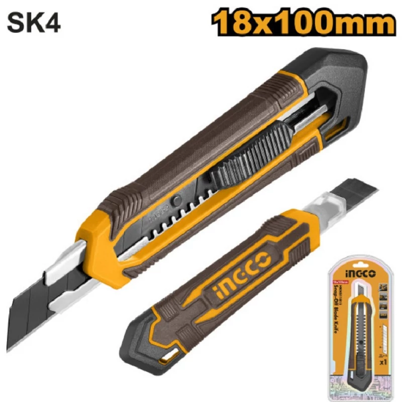 Kézzel készített, papírvágás, bőrvágás, stb.Az anti-csúszás erő gomb megakadályozza a csúszást erő hatására. A tok végénél egy farokfedél található a penge végén, amit ki lehet húzni és eltörni a tompa pengefej eltávolításához. A pengén SK4 fekete penge található, ami élesebbé teszi a vágást, tartósabbá és nem könnyen rozsdásodik. A penge nagy területen van bevonva gumival, ami kényelmesebbé teszi a fogását.Penge méret: 18 x 100 mmHossz: 179 mmSK4 penge (HKNSB112)Automata zár Szállítási terjedelem: 1 db törhető pengés kés, Bliszterben